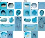Fig. 3. Spatial expression patterns of Zic1 and Zic2 in Xenopus embryos. Series of embryos were hybridized with digoxigenin-labeled antisense Zic1 (AâL) and Zic2 (MâX) RNA. (A,M) blastula stage (stage 9). In the blastula stage, Zic1 and Zic2 were expressed throughout the ectoderm (A, animal side; V, vegetal side). (B,C,N,O) mid-gastrula stage (stage 10.5). (C) The expression of Zic1 in the prospective neural plate was confirmed in a cross-section of the same embryo as in B (arrowhead). However, Zic2 was expressed in a broader region of the ectoderm (N,O). (D,P) Stage 11â12. (E,Q) Stage 12.5â13.5. (F,R) Stage 14â15. White and black arrowheads indicate the lateral edge of the neural plate and the neural crest, respectively. Arrows indicate the neural plate border region of the prospective rhombencephalon. (G,H,S,T) Stage 20. The black arrowhead, white arrowhead and arrow indicate the telencephalon, diencephalon and mesencephalon, respectively. (IâL,UâX) Stage 30. Transverse section through the head (J,V) and trunk region (L,X) of the same embryo as in (I,U). (K,W) magnified views in the head region of I and U. (A,M,I,U) are lateral views. The upper side of the panel is the animal side in (A,M). (B,N) Dorsal-vegetal views. (DâG,PâS) Dorsal views. (DâF,PâR) anterior side is upper side. (G,S) The anterior side is toward the left. (H,T) Anterior views of (G,S). The upper side is dorsal. dl, dorsal lip; bp, blastopore; s, somite; nt, neural tube; ov, optic vesicle; tel, telencephalon; di/mi, diencephalon and midbrain boundary; rh, rhombencephalon; e, eye; ev, ear vesicle; cg, cement gland. |