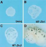 Fig. 7. Zic1 and Zic2 induced anterior neural marker genes and a neural crest marker gene without mesoderm induction in animal cap explants, as seen with Zic3 Embryos were injected with MT-Zic3 or MT-Zic1 mRNA at the two-cell stage. Animal caps were explanted at stage 9 and cultured. When sibling embryos reached stage 25, the expression of anterior-posterior marker genes (En2 and HoxB9 (=Xlhbox6)), a pan-neural marker gene (NCAM), a neuronal differentiation marker (N-tubulin), a neural crest marker (Xtwi), and a dorsal mesodermal marker (M. actin; muscle actin) were examined by RTâPCR. Although uninjected (Uninj.) caps expressed none of these markers, animal caps injected with Zic1, Zic2, or Zic3 mRNA expressed the anterior marker (En2) and the neural crest marker (Xtwi) while expressing neither the posterior marker (HoxB9) nor the dorsal mesodermal marker (M. actin). In each experiment, sibling control embryos served as a positive control (Embryo) and PCR on the same RNA without reverse transcription was done to verify the absence of genomic DNA (RT-PCR). |