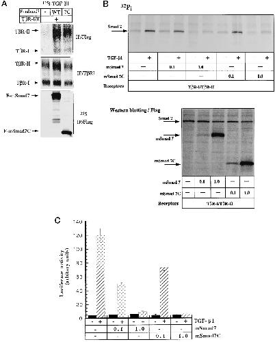mSmad7 C-domain is sufficient for binding to TGF-β receptor complex and inhibition of TGF-β-induced responses. A, association of wild-type F-mSmad7 (WT) and F-mSmad7C (7C) with TGF-β receptor complex. COS cells were transfected with F-mSmad7 (WT or7C) in combination with TβR-I and TβR-II. The receptors were covalently affinity labeled with 125I-TGF-β1, and cell lysates were subjected to immunoprecipitation with Flag antiserum.B, mSmad7C inhibits TβR-I-mediated phosphorylation of Smad2. COS cells were transfected with F-Smad2 alone or together with F-mSmad7C or wild-type F-mSmad7 in the presence of BMPR-IB and BMPR-II; cells were labeled with [32P]orthophosphate and incubated in the absence or presence of BMP-7, and subjected to immunoprecipitation with Flag antisera. Expression of F-Smad2, F-mSmad7, and F-mSmad7C was determined by immunoblotting with Flag on aliquots of cell lysates.C, transfection of mSmad7C blocks TGF-β-induced p3TPLux transcriptional response but less efficient than wild-type mSmad7.