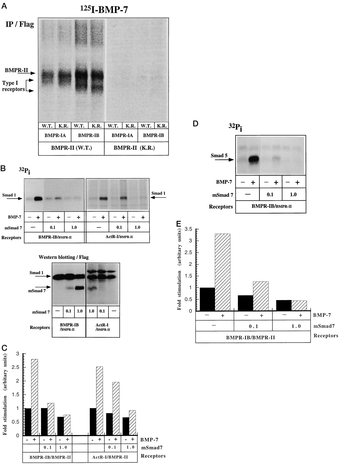 mSmad7 interacts with BMP receptor complexes and inhibits BMP-mediated Smad phosphorylation. A, association of N-terminal Flag-tagged mSmad7 (F-mSmad7) with BMPR-IA and BMPBR-IB in complex with BMPR-II. COS cells were transfected with varioustype I receptors (tagged at C termini with hemaglutinin epitope) with either wild-type (W.T.) or kinase-deficient (K.R.) versions of BMPR-II. The BMP receptors were covalently affinity labeled with 125I-BMP-7, and cell lysates were subjected to immunoprecipitation with Flag antiserum. Equal expression of receptors after transfection was determined directly on aliquots of cell lysates (data not shown). B, mSmad7 inhibits BMPR-IB- and ActR-I-mediated phosphorylation of Smad1. COS cells were transfected with F-Smad1 alone or together with F-mSmad7 in the presence of type I receptors (BMPR-IB or ActR-I) and BMPR-II, after which cells were labeled with [32P]orthophosphate in the absence or presence of BMP-7 and immunoprecipitated with Flag antisera. Expression of F-Smad1 and F-mSmad7 was determined by immunoblotting with Flag on aliquots of cell lysates. C, the32P-label radioactivity associated with Smad1 inpanel B was quantified by using a FujiX Bio-Imager and plotted. D, mSmad7 inhibits BMPR-IB phosphorylation of Smad5. COS cells were transfected with F-Smad5 alone or together with F-mSmad7 in the presence of BMPR-IB and BMPR-II; cells were labeled with [32P]orthophosphate in the absence or presence of BMP-7 and subjected to immunoprecipitation with Flag antisera.E, the 32P-label radioactivity associated with Smad5 in panel D was quantified by using a FujiX Bio-Imager and plotted.