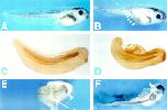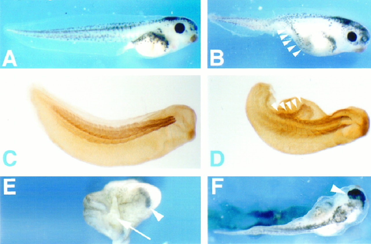 Overexpression of mSmad7 in Xenopusembryos induces formation of a partial secondary axis and eye defects. Photomicrographs of control tadpole (A) and sibling tadpole (B) made to misexpress mSmad7 in ventral cells. Note induction of partial secondary dorsal axis (arrowheads). C and D, control (C) and mSmad7-RNA (D) injected sibling showing immunoreactive muscle in primary and secondary (arrowheads) axes; E, eye defects (arrowhead) and spina bifida (arrow) in an embryo made to overexpress XSmad7 in dorsal cells; F, fusion of eyes (arrowhead) in an embryo made to overexpress mSmad7 in dorsal cells.