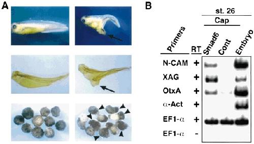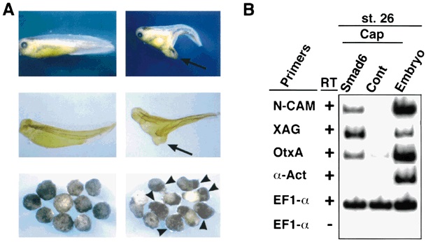 Figure 3. Smad6 antagonizes BMP signalling. (A) Overexpression of Smad6 in ventral cells induces the formation of a partial secondary axis (upper right, arrow) that contains immunoreactive muscle (middle right, arrow) while overexpression in dorsal cells does not induce patterning defects (upper and middle left). Overexpression of Smad6 in ectodermal cell explants (animal caps) causes formation of cement gland (lower right, arrows) while control explants maintain an epidermal appearance (lower left). (B) Smad6-injected, but not control ectodermal explants express cement gland-(XAG) and neural specific-(N-CAM, OtxA) genes but do not express the dorsal mesodermal marker α-actin (α-Act) as analysed by RT-PCR. EF-1α is an internal control. The faint Otx signal in the control explant lane was not observed in other experiments and is probably artefact.