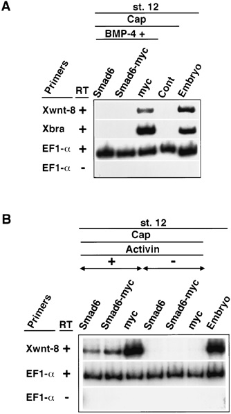 Figure 4. Smad6 inhibits mesoderm induced by BMP-4 or activin. (A) Smad6, Smad6-myc or Myc-epitope tag (myc) RNAs were injected alone, or together with BMP-4 RNA, near the animal pole of two-cell embryos and animal caps were explanted at the blastula stage. Co-expression of Smad6 or Smad6-myc blocked BMP-4-mediated induction of Xwnt-8 or Xbra expression as analysed by RT-PCR in the presence (+) and absence (â) of reverse transcriptase (RT) at control stage 12. EF-1α is an internal control in all RT-PCR experiments. (B) Smad6, Smad6-myc or Myc-epitope tag mRNA was injected into animal pole of two-cell embryos. Animal caps were isolated at blastula stage and cultured in the presence or absence of human activin A (20 ng/mL) until sibling embryos reached stage 12 at which time expression of Xwnt-8 and EF-1α was analysed by RT-PCR. Smad6 or Smad6-myc partially blocked activin-mediated induction of Xwnt-8.