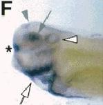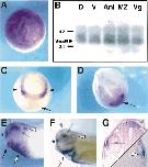 Figure 2. The spatial pattern of expression of Smad6 in developing Xenopus embryos analysed by whole-mount in situ and Northern blot hybridizations. (A) Animal-pole view of a gastrula stage (stage 10) embryo showing uniform Smad6 expression. (B) 10 μg of RNA dissected from the dorsal (D) or ventral (V) halves, or from the animal (Ani), marginal zone (MZ) or vegetal (Vg) thirds of early (stage 10) gastrulae was subjected to Northern blot analysis to detect Smad6 transcripts. The position of 18S (2.1 kb) and 28S (4.2 kb) ribosomal RNAs is indicated to the left of the blot. (C) Anterior-dorsal view of a neurula stage (stage 15) embryo showing Smad6 expression in lateral regions of the anterior neural plate (arrowheads) and weak expression in the prospective cement gland region (arrow) which becomes much stronger by stages 17â18 (D; anterior-dorsal view) and is restricted to the ventral half of the cement gland by stage 30 (E; lateral view, black arrow). (F) Lateral view of a stage 36 embryo cleared in benzyl benzoate:benzyl alcohol (2:1). (G) Transverse sections of stage 36 embryos at the levels of the eye (left) and otic vesicle (right). (EâG) Staining of the dorsal neural tube (grey arrowheads); dorsal eye (grey arrows); lateral otic vesicle (white arrowheads); olfactory placodes (asterisks) and heart anlage (white arrow) is denoted.
