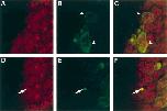 Figure 5. Smad6 protein accumulates at the plasma membrane and in the nuclei of overexpressing cells. Embryos were injected at the two-cell stage with 200 pg of plasmid pCS2+Smad6-myc, fixed at stage 12 and immunostained with antimyc antibody (9E10) which was visualized using a fluoroscein-conjugated anti-mouse secondary antibody (green; B,E) followed by nuclear staining with propidium iodide (red; A,D). Overlap of nuclear and antimyc expression appears light green (C,F).
