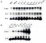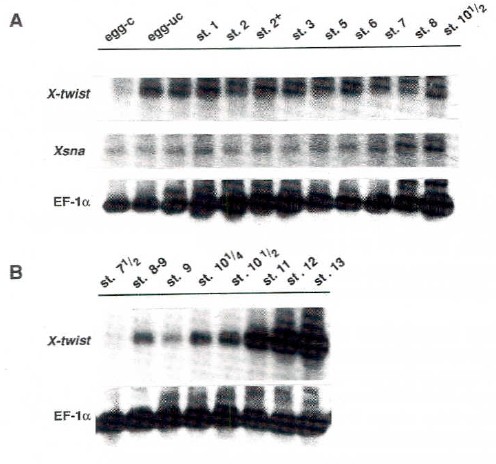 Fig. 1. Temporal early transcript detections of X-twi, Xsna. and EF1-α by RT-PCR amplifications. (A) X-twi transcripts are detected as a 350bp fragment in unfertilized eggs, and then in embryos from early stage 1 (st.1) onwards to gastrula (Sf. 10 1/2) (40 min exposure time). Xsna transcripts are detected as a 450bp fragment almost at constant level throughout all stages tested from unfertilized eggs to stage 7 embryos (20 min exposure time). EF1-α transcript amplification was used as a control for quantification (20 min exposure time). All those experiments were performed in parallel on the same RNA samples. egg-c: RNA extracted from dejellied eggs. egg-uc : RNA extracted from unjellied eggs. (81 Detailed analysis of X-twi expression prior to and just after gastrulation stage confirms that X-twi transcripts are significantly detected prior to gastrulation. EFt--α transcript amplification on the same RNA samples is shown below. |