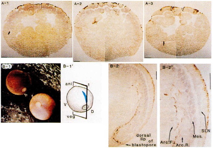 Fig. 2. X-twi expression at stages 6' /2-7 and 11 1/2. (A-1 and A-2) Transverse sections of a stage 6'/} embryo (A-I) and through a stage 7 embryo (A-2) which had been hybridized with the antisense digoxigenin-labeled probe. The X-twi transcripts are detected in bfastomeres from animal region. Notice that the transcripts are restricted towards the ventral part of the outermost animal blastomeres, and in the facing cytoplasm of the blastomeres that form the second row of eel/s. (A-3) Transverse section of a stage 6/7 embryo which had been hybridized in parallel with the sense digoxigenin-Iabeled probe. No meaningful staining could be detected within all the sections. (B.1) On a stage 11' 1/2 whole embryo, Xtwi transcripts are seen in the dorsal/posterior region above the dorsal blastopore (antisense probe: embryo to the left). The control embryo (sense probe) is shown on the right: no signal is detected in it. (B-1') Schematic drawing of the embryo hybridized with the antisense probe, with the plan of the sections. (B-2 and B.2') Sagittal sections show the detectable X-twi RNA in the involuted presumptive chorda-mesoderm cells. ani, animal pole; Arc. F., archenteron floor; Arc. R., archenteron roof. 0, dorsal region; Mes., involuted presumptive chordo-mesodermal cells,- SLN, sensorial layer of the neurectoderm; V, ventral region; veg, vegetative pole. Bar, 100 mm. |