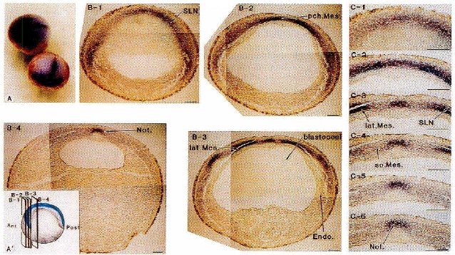 Fig. 4. X-twi expression at stage 16/17. (A)A dorsal-anterior view of two embryos shows massive accumulation of X-twi transcripts within the neural crest cells. (A') Schematic drawing of the embryo, with the plan of different sections (B-1 to B-4) Transverse sections through the embryo (anterior to posterior) show X-twi transcripts in the SLN (B-1), and in the neural crest cells, the Inner layer of the neural floor, in the dorsal part of the notochord and of the somites (B-2 to 8-4), and more weakly in the lateral mesoderm on more caudal sections (B-3 and 8-4). (C-1 to C-4) Serial sections from anterior to posterior regions of another embryo at the same stage illustrate the restricted location of X-twi in the somitogenic mesoderm. Ant., anterior region; so. Mes., somltogenic mesoderm; lat. Mes., lateral plate mesoderm; NC, neural crest ceffs; Not., notochord; Post., posterior region; SLN, sensorial layer of the neurectoderm. Bar, 100 mm. |