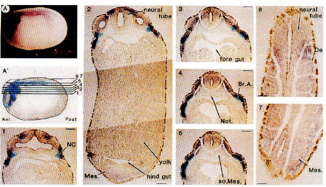 Fig. 5. X-twi expression at stage 22/23. (A) On a whole-mount lateral view of a stage 22/23 embryo, Xtwi transcripts are located in the migrating neural crest cells in the cephalic region and along the anterior/posterior dorsal axis of the embryo. (A') Schematic drawing of the embryo with the plan of different sections. (1 to 7) Frontal sections show that X-twi transcripts are located within the migrating neural crest cells of the head (1 to 5). The somitic mesoderm contains also X-twi transcripts (6 and 7), with a higher level of transcripts within the dermatome region of the anterior differentiated somites (6). Ant., anterior region; Br. A., branchial arch ceffs. De., dermatome. Mes., mesodermal celfs; so. Mes., somitogenic mesoderm; NC, migrating neural crest celfs; Not., notochord; Pose posterior region. Bar, 100 mm |