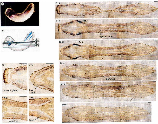 Fig. 6. X.twi expression at stage 29/30. (A) On a whole-mount lateral view of a stage 29/30 embryo, a high X-twi transcript accumulation is seen within the branchial arches and to a lesser extent along the entire dorsal region. (A') Schematic drawing of the embryo with the plan of different sections. (B-1 to 8.6) Fronta! sections show that X-twi transcripts are located within the branchial arch cells in the head region (B-1 to 8-4), in the dorsal part of the neural tube (B-1 and 8.2), and in the somites (B-1 to B-5). (C., to C-4) Higher magnifications of some sections point towards X-twi accumulation in the first visceral arches (C-1), the anterior somites (C-3)and the posterior mesoderm (C-4). There are very weak amounts of X-twi transcripts in part of the heart anlage (C-2). Br. A., branchial arch cells; Mes., mesodermal cells. Bar, 100 mm. |