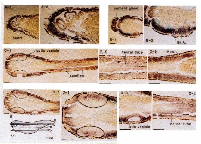 Fig. 7. X-twi expression at stage 35/36. Frontal serial sections show that X-twi transcripts are abundant within the ventral part of the first visceral arches and the forming heart (A-1 to B-2); they are less abundant in the anterior somites than in the posterior ones (C-1 to C.3); X-twi transcripts are also detected in parts of the otic and optic vesicles (D-1 to D-3) and in parts of the neural tube (D.4). E, schematic drawing of the embryo with the plan of different sections; Ant., anterior region; Br. A., cells of visceral arches II and III; Mes., mesodermal cells; Post., posterior region. Bar, 100 mm. |