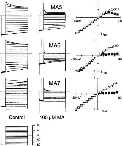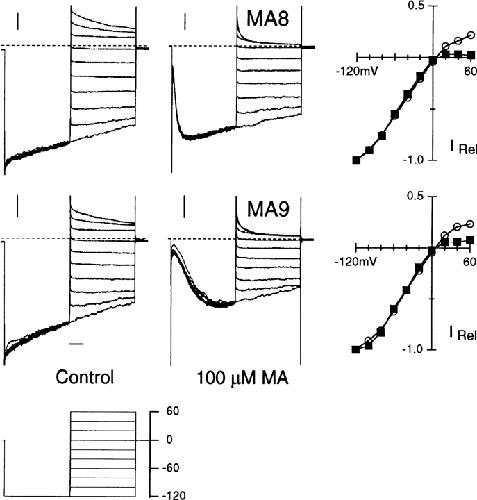 Figure 2. Monoamino alkanes cause weak inward rectification of Kir2.1 currents. (left) Kir2.1 currents recorded from an inside-out membrane patch in response to steps to voltages between −80 and +70 mV after a prepulse to −80 mV from a holding potential of 0 mV as indicated. In each case, the control recordings were obtained after removal of rectification after patch excision, and the patch was then exposed to 100 μM monoamines as indicated. Scale bars: 2 nA and 5 ms. (right) Steady state current–voltage relationships plotted from the above current traces. |