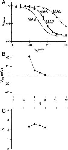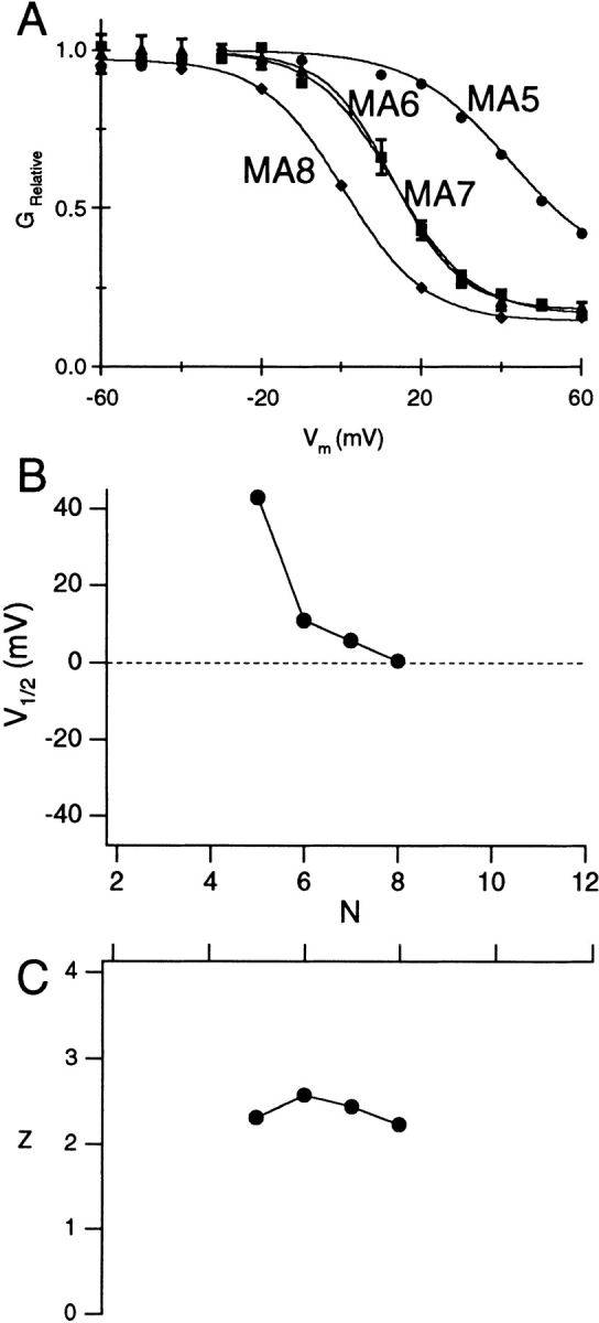 Figure 4. Monoamine blocking affinity increases with alkyl chain length. (A) Relative conductance (GRelative, see text)–voltage relationships obtained for block of Kir2.1 currents by different alkyl chain length monoamines at a concentration of 100 μM (mean values from n = 2–6 patches, ±SEM where n > 2). Smooth lines are fits of a Boltzmann function (see text) to averaged data. (B) V1/2 of block as a function of alkyl chain length (N) from fits to the data in A. (C) The effective valence of block (Z) as a function of alkyl chain length (N) from fits to the averaged data in A. |