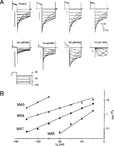 Figure 6. Monoamine unblock kinetics are strongly dependent on alkyl chain length. (A) Kir2.1 currents recorded from an inside-out membrane patch in response to voltage steps to potentials between 0 and −150 mV after a prepulse to +50 mV, from a holding potential of 0 mV as indicated. In each case, the control recordings were obtained after removal of rectification after patch excision, and the patch was then exposed to 100 μM monoamines as indicated. Scale bars: 2 nA and 5 ms. (B) Time constant of unblock (τOff) obtained from exponential fits (see text) to currents like those shown in A plotted versus membrane potential (Vm). |