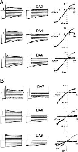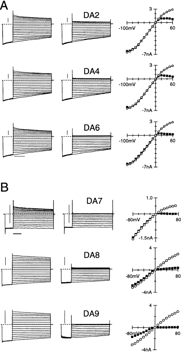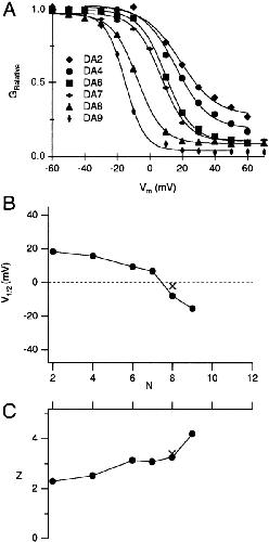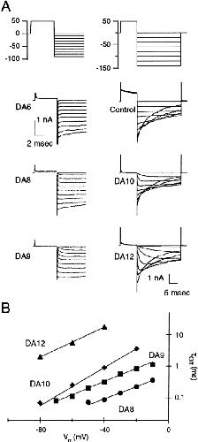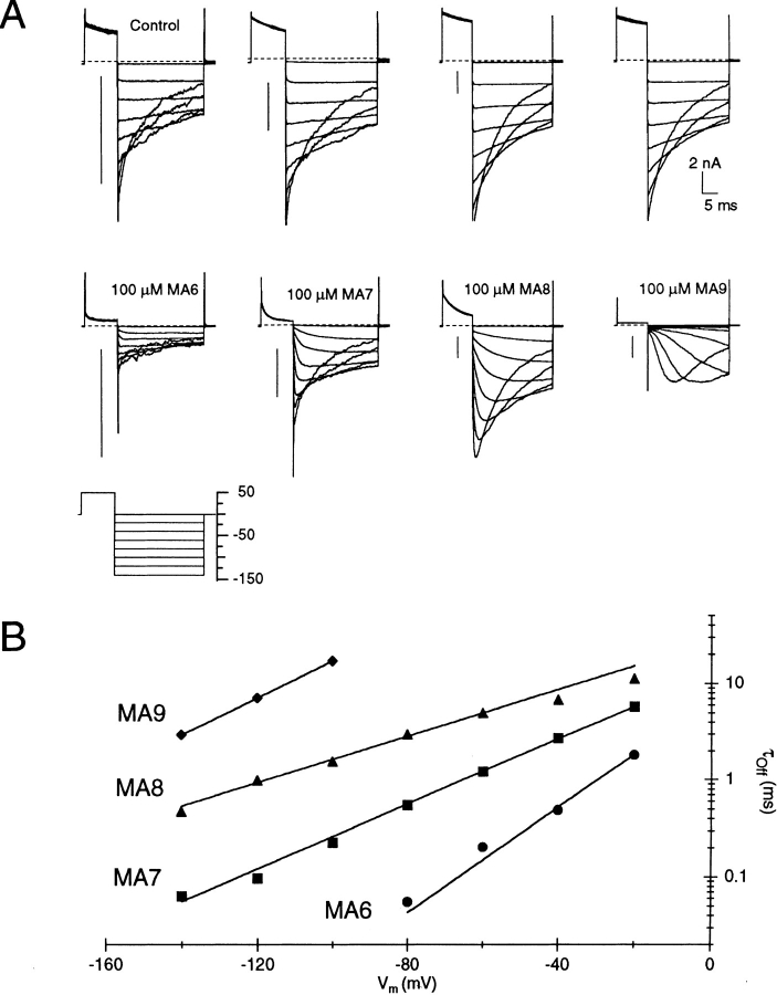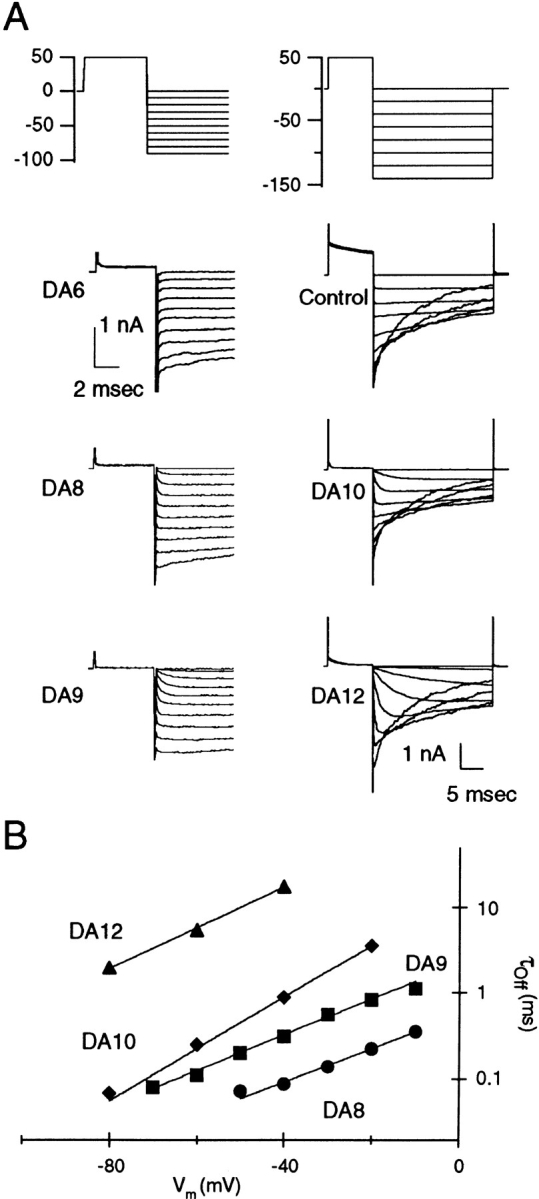 Figure 10. Diamine unblock kinetics are dependent on alkyl chain length. (A) Kir2.1 currents recorded from an inside-out membrane patch in response to voltage steps to voltages between 0 and −100 or −150 mV after a prepulse to +50 mV, from a holding potential of 0 mV as indicated. The currents were obtained sequentially (DA6, Control, DA8, DA10, DA9, DA12) with exposure to 100 μM diamines as indicated. Scale bars are 1 nA and 2 or 5 ms as indicated. (B) Time constant of unblock (τOff) obtained from exponential fits (see text) to currents in A, plotted versus membrane potential (Vm). |