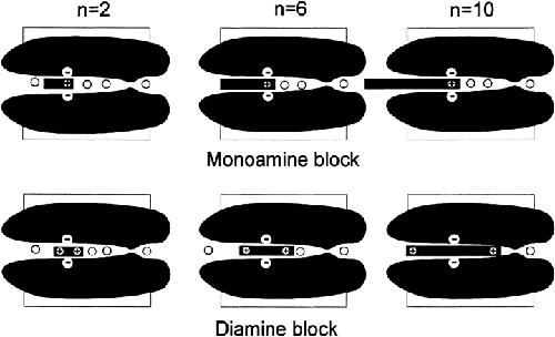 Figure 12. Accommodation of polyamines within the pore of Kir channels. Kir pores are hypothesized to have a long (>20 Å) inner vestibule with strong electronegativity provided by the ring of negative charges at the “rectification controller” position (D172). While more peripheral negative charges (e.g., E224) may provide additional peripheral amine binding sites, a single diamine (bottom) can occupy the deep pore, the two amines being equidistant from the center of the ring of negativity at the rectification controller. As alkyl chain length increases, the head amine is pushed deeper into the pore, displacing K+ ions to the outside of the cell. Monoamines (top) can also occupy the pore, but the head amine remains in the ring of electronegativity provided by the rectification controller, the alkyl chain stretching back out of the pore. |