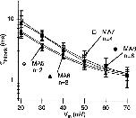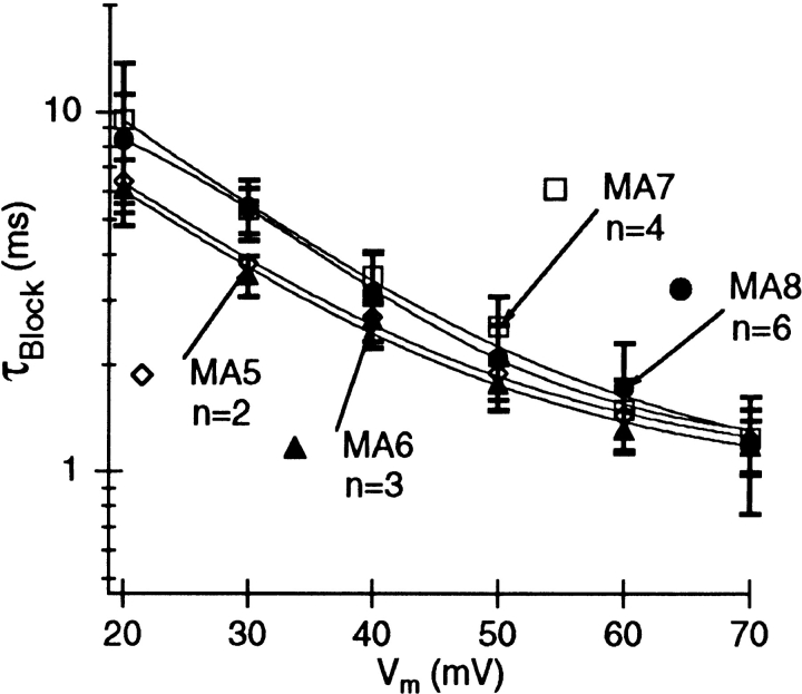 Figure 5. Monoamine block kinetics are voltage dependent. Time constant of block (τBlock) obtained from single exponential fits to currents like those shown in Figs. 2 and 3 plotted versus membrane potential (Vm). |