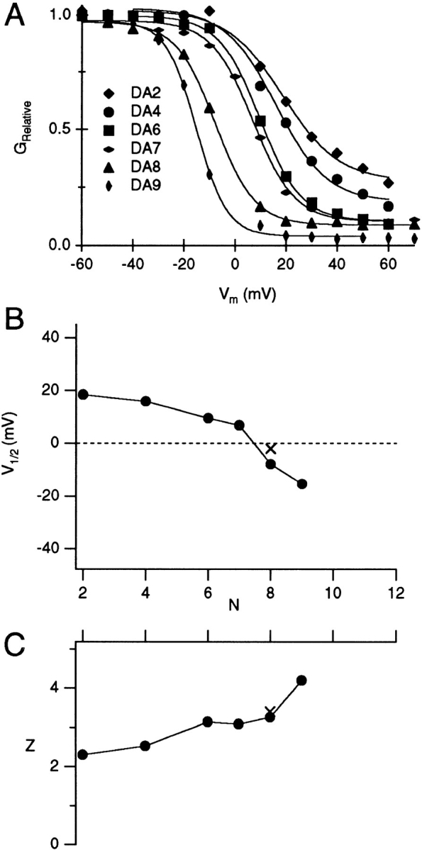 Figure 8. Diamino alkane blocking affinity and effective valency increase with chain length. (A) Relative conductance (GRelative, see text)–voltage relationships obtained for block of Kir2.1 currents by different alkyl chain length diamines at a concentration of 100 μM. Smooth lines are best fits of a Boltzmann function (see text) to representative experiments in Fig. 7. (B) V1/2 of block as a function of alkyl chain length (N) from fits to the data in A. (C) The effective valence of block (Z) as a function of alkyl chain length (N) from fits to the data in A. In B and C, X indicates the V1/2 and Z obtained for block by 100 μM spermidine. |