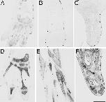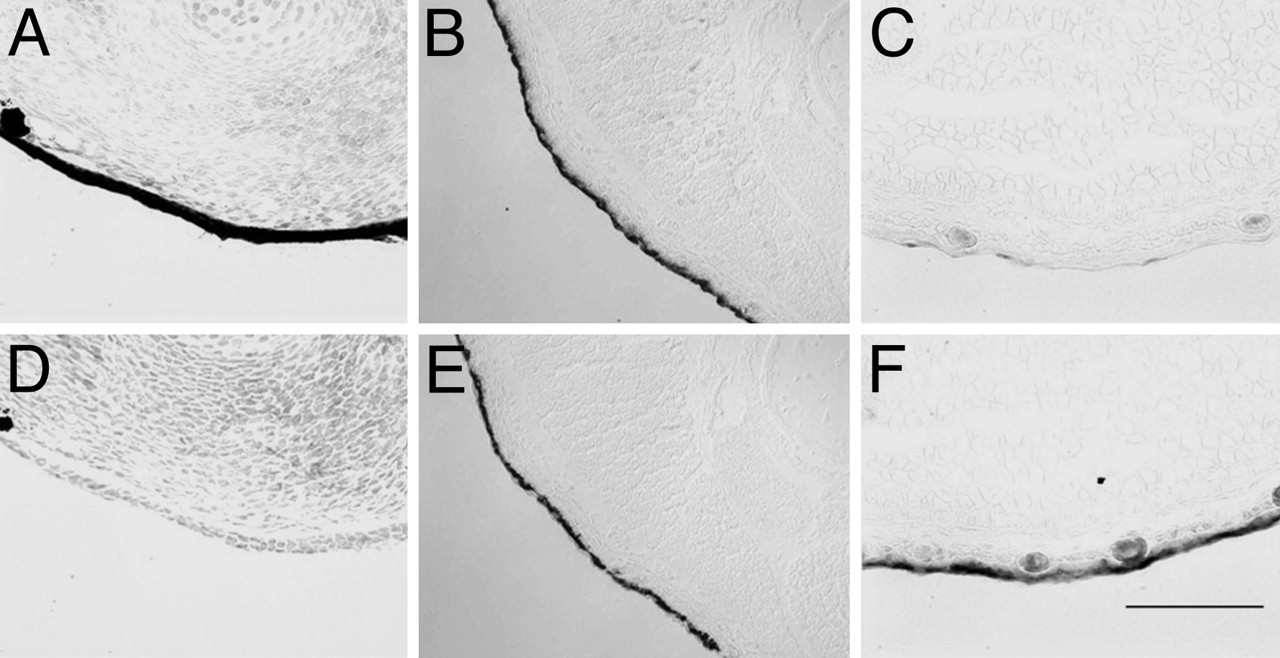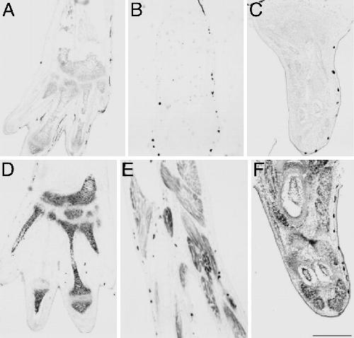 Fig. 4. Tadpoleskin covering the limb changes to adult skin at the climax of metamorphosis. Shown are in situ hybridizations of limb cross sections (14) with larval keratin (X04807; AâC) and adult keratin (X02895; DâF). Stages were as follows: NF 53 (A and D), NF 59 (B and E), and NF 62 (C and F). (Scale bar: 200 μm.)