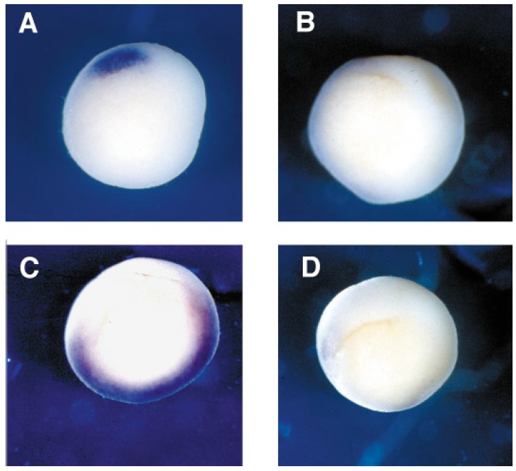 hybridization was performed using Gsc or Vox antisense probes. (A) Uninjected embryoâGsc is expressed in the dorsal lip. (B) Embryo