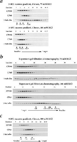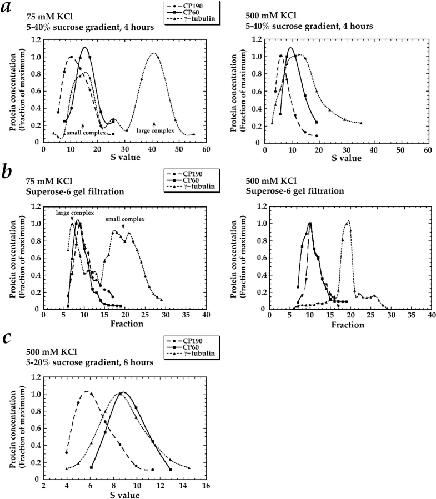 Figure 6. A graphical representation of the sucrose gradient (a)and gel filtration data (b and c) in Fig. 5. The γ-tubulin is present in two distinct complexes; CP190 and CP60 are not components of either complex. For each fraction, standard curves were used to determine the corresponding S value and the relative concentrations of CP190, CP60, and γ-tubulin (see Materials and Methods).