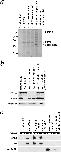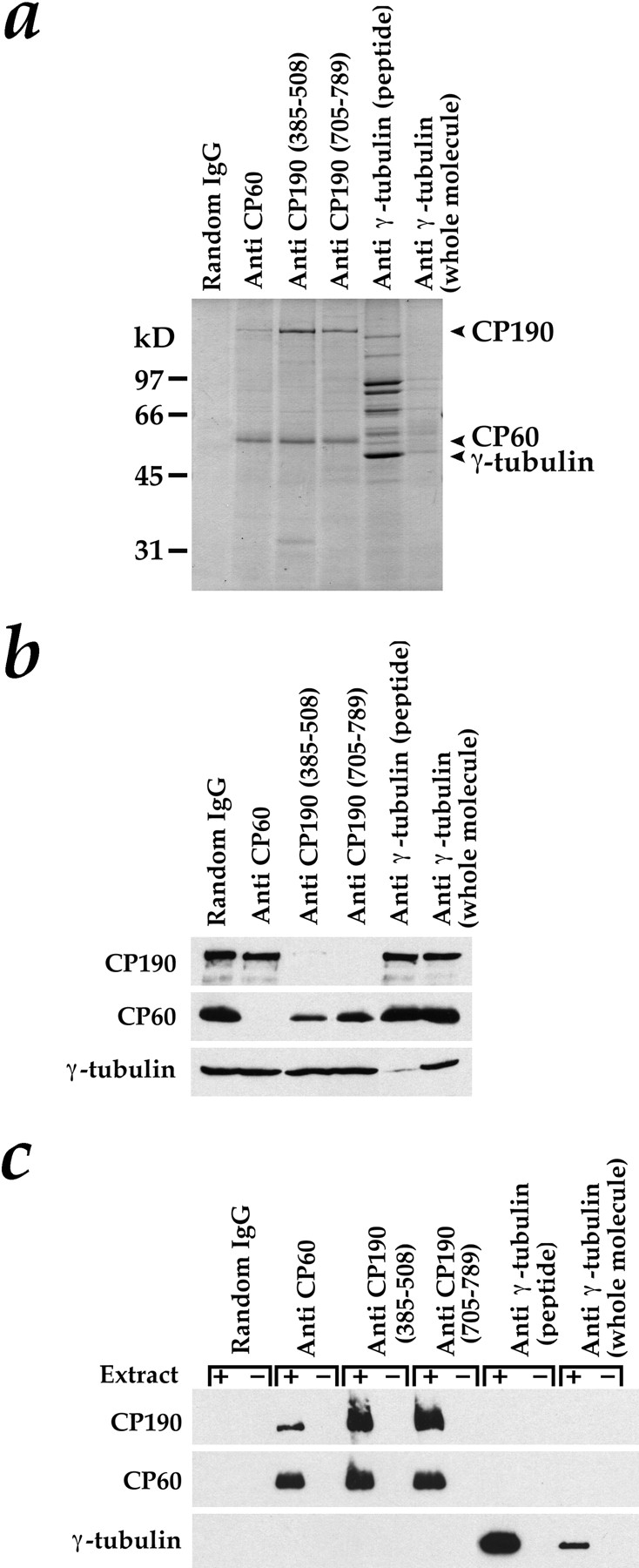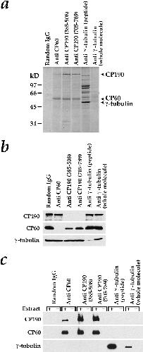Figure 4. Tests for complex formation by immunoprecipitation. Since Drosophila γ-tubulin is the same size as IgG heavy chain, the immunoprecipitations in a–c were carried out with special care to avoid any IgG contamination in the pellets (see Materials and Methods). (a) Immunoprecipitation pellets after separation by SDS-PAGE on an 11% gel and staining with Coomassie blue. Anti-CP60 immunoprecipitated CP60 and a small fraction of the CP190. Both anti-CP190 antibodies immunoprecipitated CP190 and a large percentage of the CP60. Antibodies to γ-tubulin immunoprecipitated γ-tubulin and a group of γ-tubulin–associated proteins that are components of the Drosophila γTuRC. The anti-γ–tubulin COOH-terminal peptide antibody was much more effective in immunoprecipitations than the antibody made to the whole γ-tubulin molecule. (b and c) Western blots to detect CP190, CP60, and γ-tubulin in immunoprecipitation supernatants (b) and pellets (c). In c, beads were incubated in the presence (+) or absence (−) of extract to control for antibody contamination in the pellets.