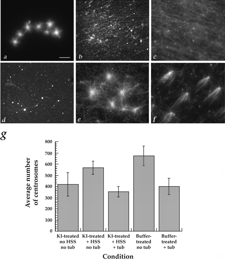 Figure 2. Examples of complementation of KI-treated centrosomes. The complementation assay was carried out as outlined in Fig. 1 and Materials and Methods. (a) Microtubule asters regrew on buffer-treated centrosomes that were incubated with rhodamine-labeled tubulin at 30°C. (b and c) Microtubules, but no asters, formed when a 228,000 g supernatant from a 0–2 h embryo extract was incubated at 30°C (b) or 0°C (c) on coverslips in the absence of centrosomes, followed by a 30°C incubation with rhodamine-tubulin. (d) When KI-treated centrosomes were incubated with buffer instead of extract, followed by rhodamine-tubulin, few microtubules and no asters formed. (e and f) Asters formed when KI-treated centrosomes were first incubated with extract at 30°C (e) or 0°C (f) and then with rhodamine-tubulin at 30°C. (g) KI- and buffer-treated centrosomes bind consistently to coverslips. The number of centrosomes bound to coverslips under the typical experimental conditions used throughout this study was determined by counting structures that were stained with antibodies against α- and/or γ-tubulin. The average number counted in 50 and 100× microscope fields is shown. Three to five separate experiments were counted for each condition. Bar, 10 μm.