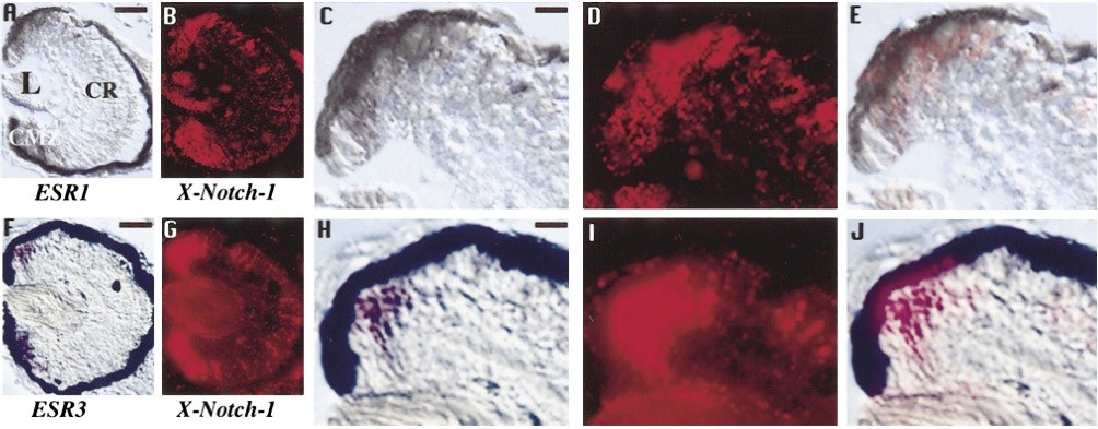 FIG. 1. Comparison of X-Notch-1 and E(spl)-related gene expression patterns in stage 40 Xenopus retina. (A) Comparison of X-Notch-1 and ESR1 expression patterns. Double in situ hybridizations were performed on sections of stage 40 Xenopus retina using DIG-labeled ESR1 probe and fluorescein-labeled X-Notch-1 probe. ESR1 expression was viewed under visible light (deep purple) and X-Notch-1 expression was viewed under fluorescence (red). A and B show the same section. (A) ESR1 expression is detected in the CMZ except in cells in the most peripheral region. (B) X-Notch-1 labeling is also detected in the CMZ except in cells in the most peripheral region. Occasional labeled cells are seen in the central retina, in late born cells (Dorsky et al., 1995). C and D show a higher magnification of the CMZ from the sections depicted in A and B, respectively. (E) Double labeling demonstrates that ESR1 and X-Notch-1 expressions overlap in the CMZ. CMZ, ciliary marginal zone; CR, central retina; L, lens. Scale bar in A and B, 100 um; scale bar in C, D, and E, 30 um. (F) Comparison of X-Notch-1 and ESR3 expression patterns. Double in situ hybridizations were performed as above with ESR3 in deep purple and X-Notch-1 in red. (F) ESR3 expression is detected in the CMZ except in cells in the most peripheral region. (G) X-Notch-1 labeling is also detected in the CMZ except in cells in the most peripheral region. H and I show a higher magnification of the CMZ from the sections depicted in F and G, respectively. (J) Double labeling demonstrates that ESR3 and X-Notch-1 expressions overlap in the CMZ. Scale bar in F and G, 100 um; scale bar in H, I, and J, 30 um |