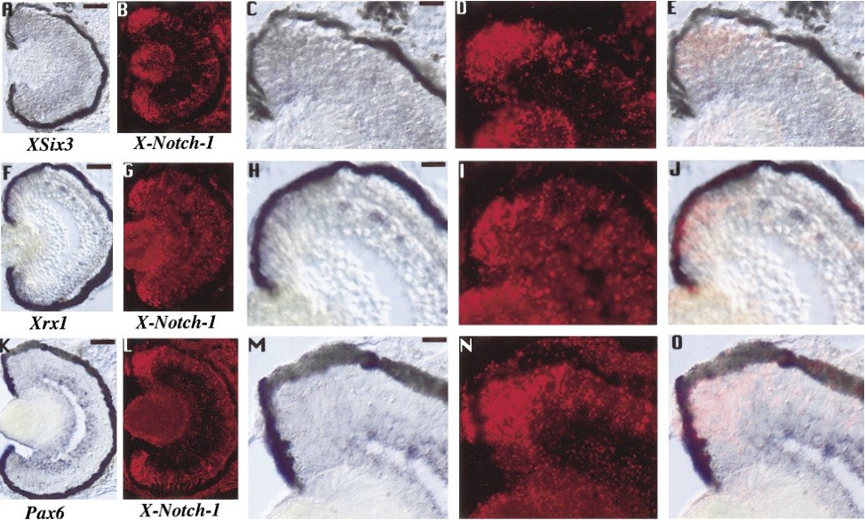 FIG. 5. Comparison in stage 40 Xenopus retina of X-Notch-1 expression with that of genes involved in early eye development. (A) Comparison of X-Notch-1 and XSix3 expression patterns. Double in situ hybridizations were performed as in Fig. 1 with XSix3 in deep purple and X-Notch-1 in red. (A) XSix3 is expressed in the CMZ, from the most peripheral cells of the retina, and in the central retina, in the ganglion cell layer and the inner nuclear layer. (B) X-Notch-1 labeling is detected in the CMZ except in cells in the most peripheral region. C and D show a higher magnification of the CMZ from the sections depicted in A and B, respectively. (E) Double labeling demonstrates that XSix3 expression starts more in the periphery than X-Notch-1 expression. Scale bar in A and B, 100 ï°m; scale bar in C, D, and E, 30 ï°m. (F) Comparison of X-Notch-1 and Xrx1 expression patterns. Double in situ hybridizations were performed as in Fig. 1 with Xrx1 in deep purple and X-Notch-1 in red. (F) Xrx1 is expressed in the CMZ, from the most peripheral cells of the retina, and in the central retina, in a subset of cells in the outer part of the inner nuclear layer and in the outer nuclear layer. (G) X-Notch-1 labeling is detected in the CMZ except in cells in the most peripheral region. H and I show a higher magnification of the CMZ from the sections depicted in F and G, respectively. (J) Double labeling demonstrates that Xrx1 expression starts more in the periphery than X-Notch-1 expression. Scale bar in F and G, 100 ï°m; scale bar in H, I, and J, 30 ï°m. (K) Comparison of X-Notch-1 and Pax6 expression patterns. Double in situ hybridizations were performed as in Fig. 1 with Pax6 in deep purple and X-Notch-1 in red. (K) Pax6 is strongly expressed in the central retina, in the ganglion cell layer and in the inner part of the inner nuclear layer, and faint staining is also detected throughout the CMZ. (L) X-Notch-1 labeling is detected in the CMZ except in cells in the most peripheral region. M and N show a higher magnification of the CMZ from the sections depicted in K and L, respectively. (O) Double labeling demonstrates that the strong expression of Pax6 and X-Notch-1 expression does not overlap but that the faint expression of Pax6 in the CMZ starts more peripherally than X-Notch-1 expression. Scale bar in K and L, 100 um; scale bar in M, N, and O, 30 um. |