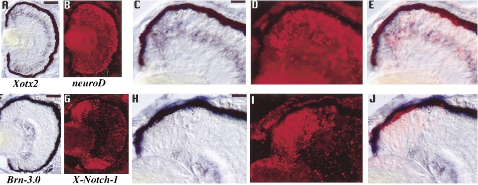 FIG. 6. Comparison in stage 40 Xenopus retina of X-Notch-1 or neuroD expressions with that of genes involved in cellular determination of retinal cells. (A) Comparison of Xotx2 and neuroD expression patterns. Double in situ hybridizations were performed as in Fig. 1 with Xotx2 in deep purple and neuroD in red. (A) Xotx2 expression was seen in cells in the CMZ and in the central retina, in the outer part of the inner nuclear layer. (B) neuroD labeling was seen in cells in the CMZ and in the central retina, in the outer part of the inner nuclear layer and the outer nuclear layer. C and D show a higher magnification of the CMZ from the sections depicted in A and B, respectively. (E) Double labeling demonstrates that neuroD and Xotx2 expressions start at the same level in the CMZ and that they overlap in the outer part of the inner nuclear layer. Scale bar in A and B, 100 ï°m; scale bar in C, D, and E, 30 um. (F) Comparison of X-Notch-1 and Brn-3.0 expression patterns. Double in situ hybridizations were performed as in Fig. 1 with Brn-3.0 in deep purple and X-Notch-1 in red. (F) Brn-3.0 is only expressed in the ganglion cell layer. (G) X-Notch-1 labeling is detected in the CMZ except in cells in the most peripheral region. H and I show a higher magnification of the CMZ from the sections depicted in F and G, respectively. (J) Double labeling of retina demonstrates that Brn-3.0 and X-Notch-1 expressions do not overlap. Scale bar in F and G, 100 um; scale bar in H, I, and J, 30 um |
