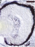 pou4f1 (POU class 4 homeobox 1) gene expression in Xenopus laevis embryos, NF stage 40, as assayed by in situ hybridization. Lateral view of sectioned eye. |