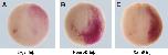 FIG. 9. Overexpression of Xath5 and NeuroD promotes ectopic activation of Brn3.0 expression. Embryos were injected at the two-cell stage with RNA for ï°-galactosidase either alone (A) or in combination with RNA for neuroD (B) or Xath5 (C) and then cultured until stage 14 (neural plate stage). The embryos were stained with Magenta-gal (magenta color) to detect ï°-galactosidase expression, followed by whole-mount in situ hybridization using a digoxigenin-labeled Brn-3.0 probe (dark purple). All embryos are shown in a dorsoanterior view with the injected side on the right. (A) A control embryo injected with RNA for ï°-galactosidase, showing Brn-3.0 expression as two discrete patches in the anterolateral neural plate. (B) An embryo injected with RNA for neuroD and ï°-galactosidase showing an expanded patch of expression of Brn-3.0 in the anterolateral neural plate. (C) An embryo injected with RNA for Xath5 and ï°-galactosidase showing general activation of Brn-3.0 expression on the injected side with the most enhanced expression at the anterior of the embryo |