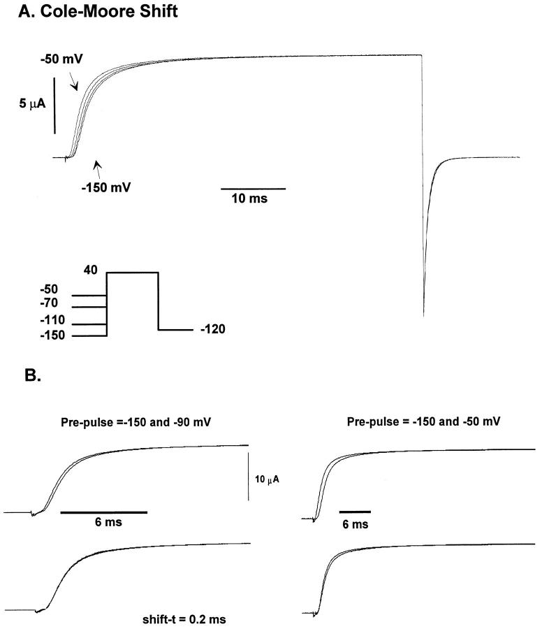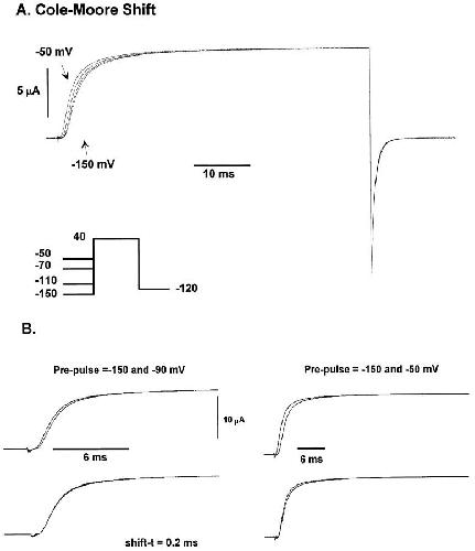 Figure 3. Kinetics of early transitions of the activation pathway using the Cole-Moore protocol. (A) Family of macroscopic ionic currents from ShH4ir obtained at 15.1°C elicited in response to variable hyperpolarized prepulses (between −150 and −50 mV), followed by a 40-mV test pulse and a postpulse of −120 mV (Cole-Moore protocol). The holding potential was −90 mV. A P/−4 subtraction protocol was used. Data was filtered at 5 kHz and digitized every 60 μs. Internal solution: 120 K+-MES, and external solution, 60 K+-MES. (B) Superposition of the ionic current traces obtained with the Cole-Moore protocol at 18.7°C. Holding potential was −90 mV. P/−4 subtraction protocol was used. Data was filtered at 5 kHz and digitized every 50 μs. Internal solution 120 K+-MES and external solution 60 K+-MES. Shown are the ionic current superposition after shifting in time (shift-t), using as a reference the current obtained with a −150 mV prepulse. Notice the excellent superposition between the traces obtained with prepulses of −90 and −150 mV, and the poor superposition of the −50 and −150 mV pre-pulses. |