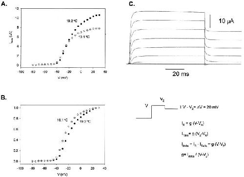 Figure 5. Conductance (G) versus voltage (V) curve. (A) G-V curves obtained at two different temperatures, 19.2 (•) and 10.05 (○) °C. (B) Normalized delta family G-V curves for the same data shown in A. Notice the shift to the left when the temperature decreases, (∼−5 mV), corresponding to an entropic change (TΔS at 20°C) of ∼−7 kcal/mol. (C) Macroscopic ionic currents elicited with the Delta-V protocol at 19.2°C. Data obtained was filtered at 7.5 kHz and digitized every 30 μs. Test pulses (V) from −80 to 30 mV in 10-mV increments, keeping constant the difference with respect to the postpulse potential (V2) (V − V2 = 20 mV). Holding potential = −90 mV. VK, reversal potential; IR, current measured at the end of the test pulse; Itails, current measured at the onset of the postpulse; G, macroscopic conductance = nγ(V)Po, where n is the number of channels, γ(V) is the unitary conductance, and Po is open probability. Internal solution 120 K+-MES and external solution 20 K+-MES. The P/−4 subtraction protocol was used. |