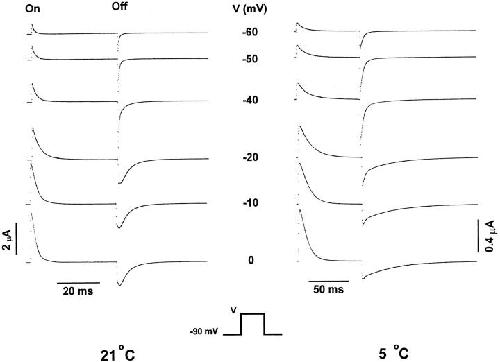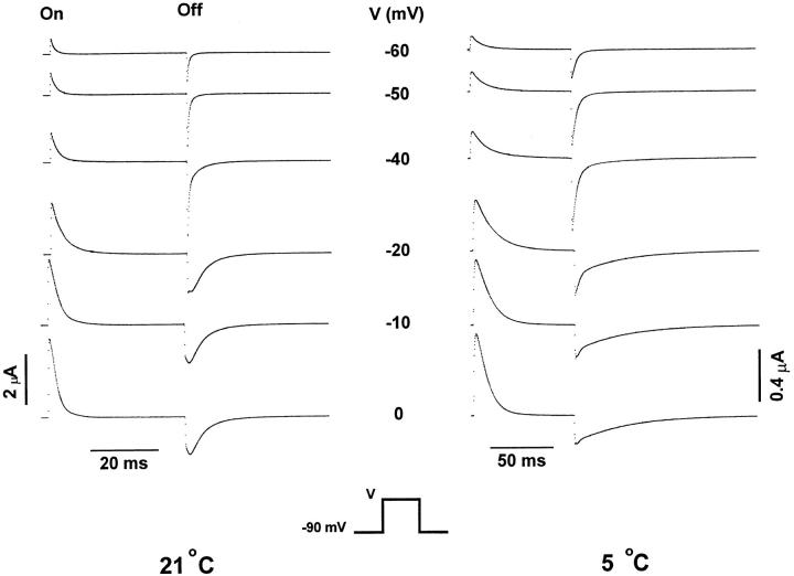Figure 7. Temperature effects on the time course of gating currents. Unsubtracted family of gating currents from shH4ir-W434F obtained at 21 and 5°C elicited in responses to variable test pulses (V). Holding potential was −90 mV. The test pulses were 40- and 80-ms long at 21 and 5°C, respectively. Postpulses were 40- and 240-ms long at 21 and 5°C, respectively. Data obtained at 21°C was filtered at 2 kHz and digitized every 70 μs. Data obtained at 5°C was filtered at 2.5 kHz and digitized every 190 μs. Notice the large effect of temperature in the kinetics of the Off response of gating currents, particularly at depolarized potentials. |