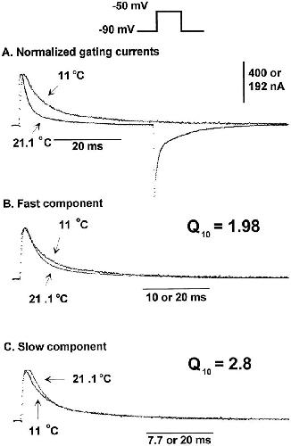 Figure 8. Kinetic behavior for the On response of gating currents obtained at −50 mV. Unsubtracted traces elicited in responses to a test pulse of −50 mV at 21.1 and 11°C. The holding potential was −90 mV. The test pulses were 40- and 80-ms long at 21.1 and 11°C, respectively. Postpulses were 160-ms long. Data obtained at 21.1°C was originally filtered at 5 kHz and digitized every 50 μs. The trace shown in the figure was digitally filtered at 2 kHz to compare with data obtained at 11°C. Data obtained at 11°C was filtered at 2 kHz and digitized every 80 μs. (A) Normalized gating currents. Traces obtained at 21.1 and 11°C normalized for the size of the peak of the On response of the gating current (multiplying by 2.08) and superimposed. (B) Fast component. Gating current trace obtained at 21.1°C multiplied by a time-expansion factor (2×) to superimpose with the first part of the gating current trace obtained at 11°C. (C) Slow component. Gating current trace obtained at 21.1°C multiplied by a time-expansion factor (2.6×) to superimpose with the second part of the gating current trace obtained at 11°C. 0 K+/0 Na+ internal and external solutions. |