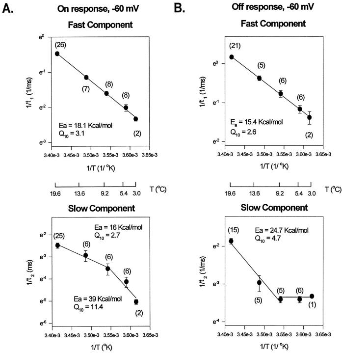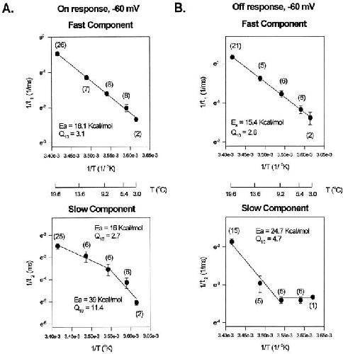 Figure 11. Arrhenius plots of kinetic components describing the gating currents elicited as a response to a test pulse of −10 mV. (A) Arrhenius plots for the On response kinetic components: fast component, slow component, and rising phase. (B) Arrhenius plot for the main decaying component of the Off response. The Arrhenius plot for the time constant of the faster decaying component that appears at low temperatures was not included (see Fig. 9). |