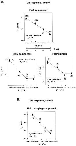 Figure 10. Arrhenius plots of the decaying kinetic components of the gating currents elicited as a response to a test pulse of −60 mV. The On and the Off responses of the experimental traces were fitted with a three- exponential function: a rising phase followed by two decaying components. (A) Arrhenius plots for the On response decaying kinetic components at −60 mV. (B) Arrhenius plot for the Off response decaying components. Energy of activation, Ea, obtained from the slope of the Arrhenius plot (slope = −Ea/R). |
