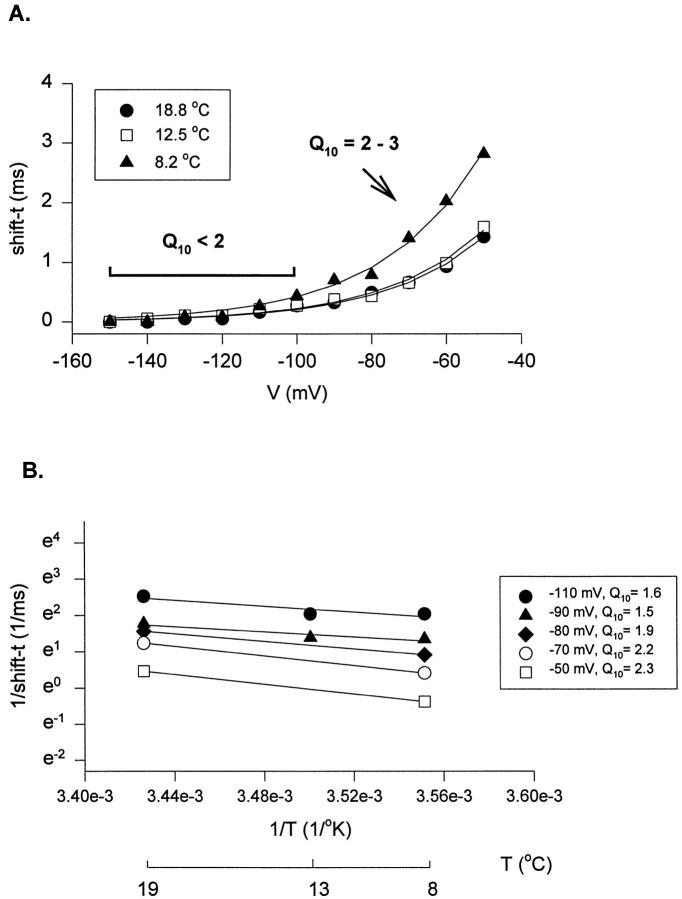 Figure 4. Temperature dependence of the Cole-Moore shift (shift-t). (A) Delay or time shift (shift-t, in milliseconds) due to the hyperpolarized prepulses at different temperatures. Lines show fit to a single exponential function of the voltage dependence of the Cole-Moore shift at each temperature tested. (B) Arrhenius plot of the Cole-Moore shift. 1/shift-t as a function of temperature at different voltages of prepulses. |