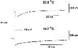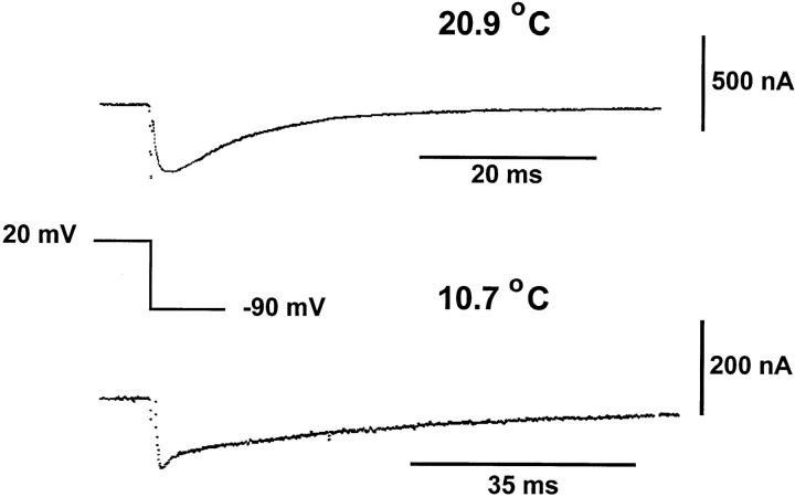 Figure 9. Time course of the Off response of gating current obtained at depolarized potentials at different temperatures. Unsubtracted Off responses traces elicited after a test pulse of 20 mV returning to −90 mV (holding potential). Traces obtained at 20.9 and 10.7°C. Gating current trace obtained at 20.9°C was originally filtered at 5 kHz and digitized every 50 μs. Trace shown in the figure was digitally filtered to 2 kHz. Gating current trace obtained at 10.7°C was filtered at 2 kHz and digitized every 80 μs. Notice that at low temperature the rising phase is lost and a faster decaying component appears. |