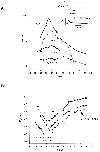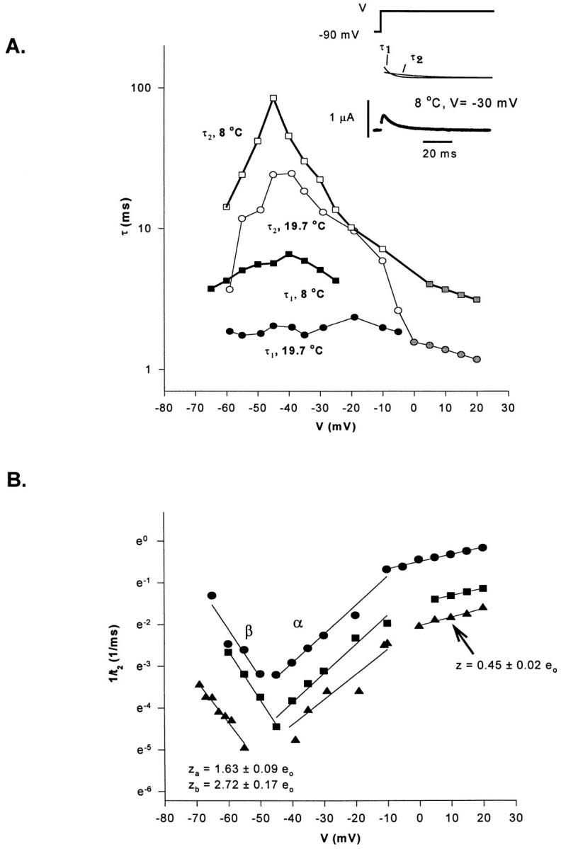 Figure 12. Time constants (τ) of the decaying components of the On response of gating currents as a function of voltage (V). (A) Voltage and temperature dependence for each kinetic component for three different experiments. Open symbols represent the slow decaying component: ○ at 19.7°C, □ at 8°C. Closed symbols represent the fast decaying component: • at 19.7°C, ▪ at 8°C. Gray symbols indicate the voltage region where the On response was fitted with one exponential function. (B) Time constant of the slow decaying component (1/τ2, 1/ms) as a function of voltage (V). Determination of the valence times the fraction of the electric field (z). Data obtained from the same experiment shown in A at three different temperatures: 19.2°C, •; 8°C, ▪; 4.5°C, ▴. Lines represent the linear regression used to estimate z from the slope of each curve (slope = z.F/ RT) at each voltage region. Notice the change in the slope for the data obtained at depolarized potentials (>−10 mV), corresponding to z = 0.45 ± 0.02 eo (n = 3). Between −65 and −45 mV, backward rates predominate, z = 2.72 ± 0.17 eo (n = 3). Between −45 and −10 mV, forward rates predominate: z = 1.63 ± 0.09 eo (n = 3). |