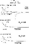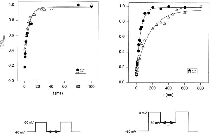Figure 13. Reactivation of gating currents after a variable recovery interval showing the kinetic behavior for each component of the total charge movement. Normalized charge movement (Q/Qmax) as a function of the duration of the test-pulse (t, ms) at two different temperatures (20.5 and 9.1°C). Data obtained from the integration of the On response of the gating currents elicited using the double-pulse protocol (Oxford, 1981), between −90 and −50 mV (left), and between −50 and 0 mV (right). |