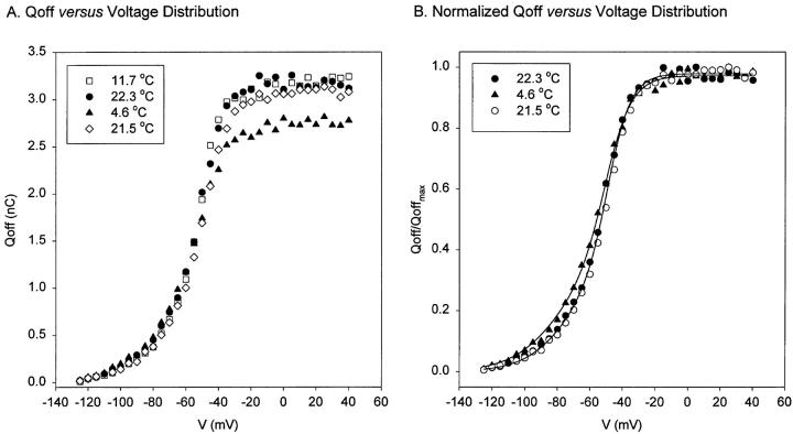 Figure 14. Q-V distributions at different temperatures. (A) Nonnormalized data from the experiment (Qoff, charge movement during the Off response versus V, voltage). Data obtained from unsubtracted gating current traces elicited from variable test pulses (V). At 11.7 and 4.6°C (□, ▴) test-pulse duration was 300 ms. At 22°C (•, ⋄), test-pulse duration was 100 ms. (B) Normalized data obtained at 4.6°C (▴) and 22°C (•, ○) (Q/Qmax versus V curve). The continuous line corresponds to the fitting with a two-step sequential Boltzmann distribution (see Eq. 6). Parameters obtained from the fit: n = 4 × 109 channels (average value for low and high temperature); z1 = 1.70 ± 0.11 eo (n = 2); z2 = 3.13 ± 0.29 eo (n = 2). At 22°C, V1 = −73.35 mV; V2 = −48.87 mV; Q1 = 0.34; Q2 = 0.64. At 4.6°C, V1 = −80.01 mV; V2 = −50.34 mV; Q1 = 0.35; Q2 = 0.62. At low temperature, the first component is shifted to the left by −7 mV, corresponding to a net decrease in entropy of ∼4 kcal/ mol at 20°C (see Table II). |