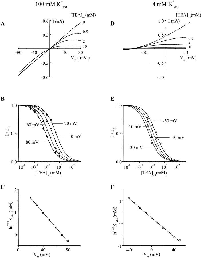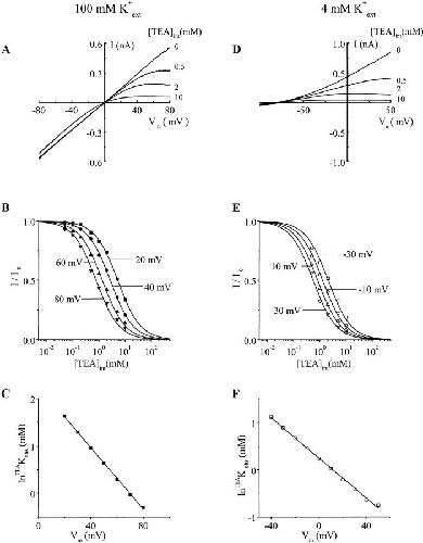 Figure 1. Voltage and extracellular K+ dependence of ROMK1 channel blockade by internal TEA. (A and D) Macroscopic I-V curves of ROMK1 channels recorded in the inside-out configuration in various [TEA]int. [K+]int was 100 mM and [K+]ext was as indicated. (B and E) Fractions of unblocked currents (I/Io) obtained from A and D were plotted against [TEA]int for several membrane voltages (Vm). Curves superimposed on the data correspond to least-squares fits using I/I0 = TEAK obs/(TEAK obs + [TEA]int) (TEAK obs is the observed TEA equilibrium dissociation constant). (C and F) ln TEAK obs obtained from B and E were plotted against Vm, respectively. The lines superimposed on the data correspond to least-squares fits using the Woodhull equation (Woodhull, 1973), lnTEAK obs = lnTEAK obs (0 mV) − TEA(zδ)obsFVm/RT.