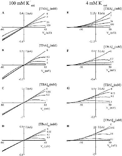 Figure 3. Voltage and extracellular K+ dependence of ROMK1 channel blockade by TEA derivatives. (A–H) Macroscopic I-V curves recorded in various concentrations of quaternary ammoniums with either 100 mM external K+ (left) or 4 mM external K+ (right). TMA, TPrA, TBA, and TPeA stand for tetramethylammonium, tetrapropylammonium, tetrabutylammonium and tetrapentylammonium, respectively. [K+]int was 100 mM and [K+]ext was as indicated.