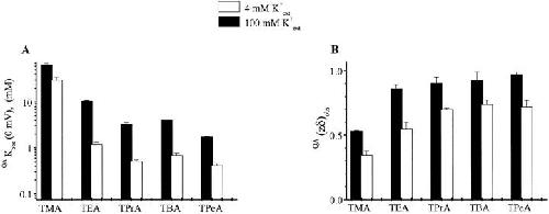 Figure 4. Summary of extracellular K+ dependence of ROMK1 channel blockade by TEA and its derivatives. QAK obs (0 mV) and QA(zδ)obs (mean ± SEM, n = 5) values obtained as described in Fig. 1.