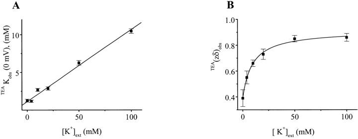 Figure 2. Summary of extracellular K+ dependence of ROMK1 channel blockade by internal TEA. (A) TEAK (0 mV) was plotted against [K+]ext. The line corresponds to the least-squares fit of a linear equation. (B) TEA(zδ)obs (mean ± SEM, n = 5) was plotted against [K+]ext. The curve corresponds to the least-squares fit by the equation TEA(zδ)obs = {TEA(zδ)inf − TEA(zδ)0 [K+]ext}/([K+]ext + KK app) + TEA(zδ)0, where KK app is the apparent (empirical) dissociation constant for the binding of external K+ to the pore, while TEA(zδ)0 and TEA(zδ)inf are TEA(zδ)obs when concentrations of external K+ ([K+]ext) are zero and infinity, respectively. The fit gives that TEA(zδ)0 = 0.39, TEA(zδ)inf = 0.92, and KK app = 9.6 mM. The data points corresponding to 0 mM external K+ were obtained in a nominal K+ free solution.