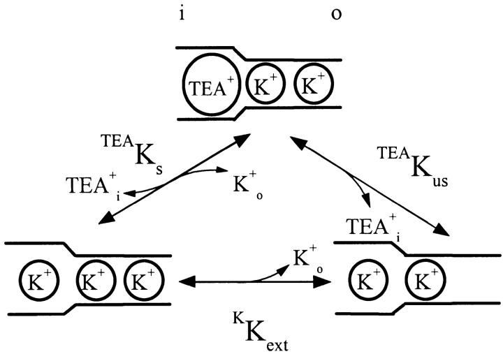 Figure 7. A model for TEA binding to a pore with three K+ sites. The model, modified from the model in Fig. 6 B, has two K+ sites in the narrow region of the pore and a third site in a wider internal region where either K+ or TEA can bind.