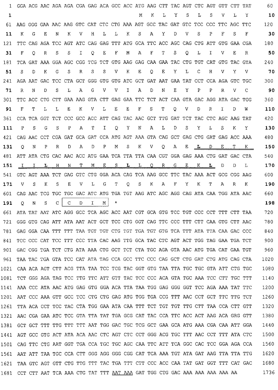 numbers in bold. Leucine zipper is double underlined (heptad leucine residues are bolded) and CAAX-like motif at the C-terminal is boxed.
