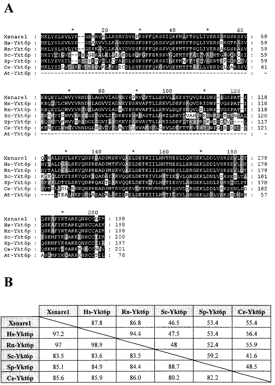 FIG. 2. Comparison of Xsnare1 with a novel prenylated v-SNAREs from other species. (A) The abbreviation are: Hs, Homo sapiens; Rn,